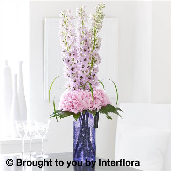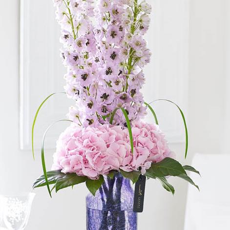 Stylish, elegant and wonderfully feminine, these magnificent delphiniums and delicate hydrangea are a true celebration of natural beauty. Notice how these soft shades of palest lilac and pink seem to shimmer in the light? An exquisite gift choice for someone very special.