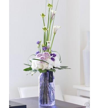 Featuring lilac/white Vermeer calla lilies, white Snowball hydrangeas, lilac Ocean Song large headed roses, white Saundersiae ornithogalum and purple Rosita lisianthus, aralia leaves, steel grass, tied with lily grass and arranged in a purple crackled glass vase with Interflora Luxury Gift Packaging for maximum impact.