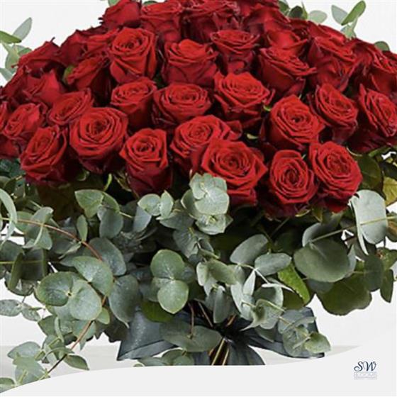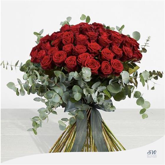 Indulge in luxury with our Naomi Rose Hand-Tied Bouquet. This arrangement showcases 40 Naomi Grade A Roses, known for their exceptional quality and beauty, tied with long-stemmed Eucalyptus. Elevate any occasion with this stunning bouquet—a perfect blend of sophistication and natural charm.