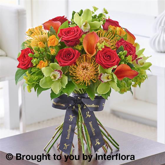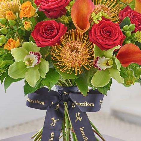 Featuring orange Captain Odeon calla lilies, green Alice Anderson cymbidium orchid heads in individual hydrating tubes, green Coco Bamboo hypericum, red Naomi large headed roses, orange abeba spray roses and orange Soleil leucospermum with bupleurum and salal, expertly handtied and presented in luxurious packaging for maximum impact when your gift is delivered.