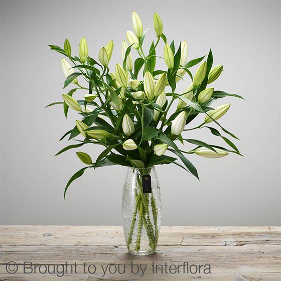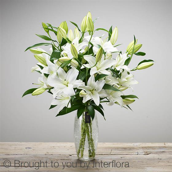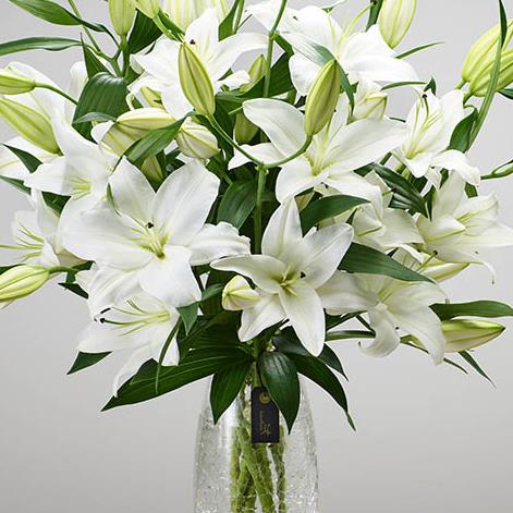 A generous selection of fresh, crisp white Oriental lilies are presented in a crackle glass vase. A truly elegant choice to convey your thoughts.