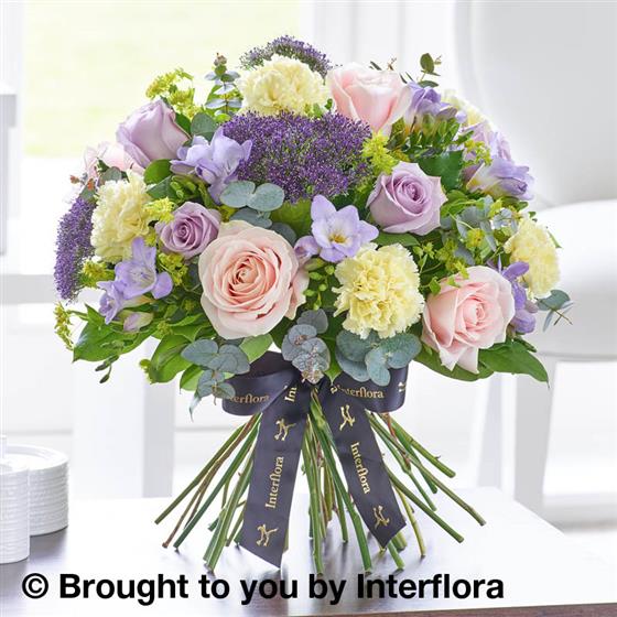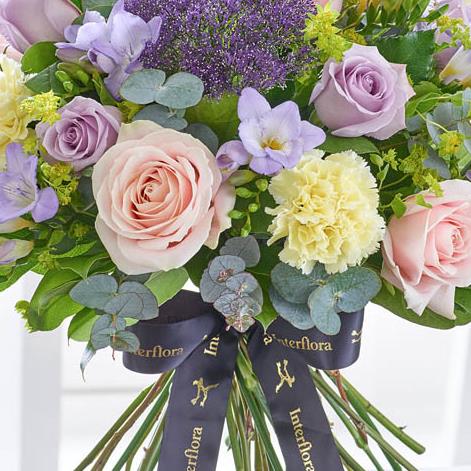 Featuring St Cream carnations, pale pink Sweet Avalanche large headed roses, lilac Ocean Song large headed roses, lilac Blue Moon freesia and lilac Blue Lane trachelium with bupleurum, eucalyptus and salal, expertly handtied and presented in luxurious packaging for maximum impact when your gift is delivered.