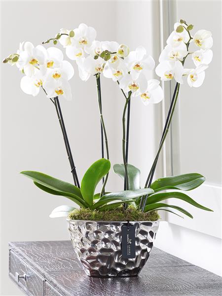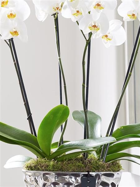 Featuring a pair of white twin-stemmed phalaenopsis orchids planted in a silver dimple oval ceramic planter trimmed with moss and finished with luxury gold and black gift wrapping for maximum impact when your gift is delivered.