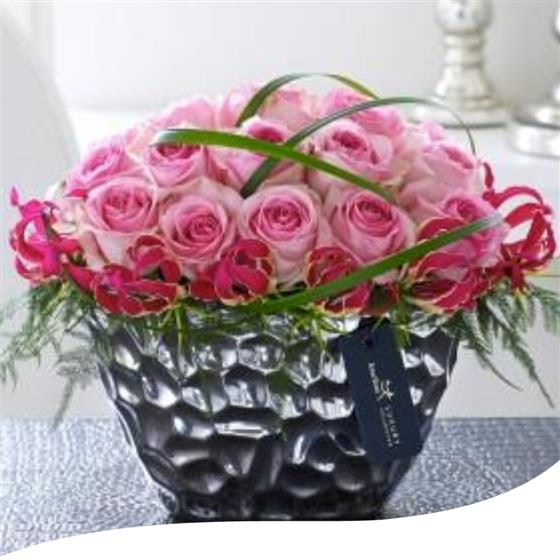 Featuring red short gloriosa rothschildiana and pink/white Avalanche Sorbet large headed roses with asparagus fern and lily grass, expertly arranged in a silver dimple oval ceramic planter and finished with luxury gold and black gift wrapping for maximum impact when your gift is delivered.