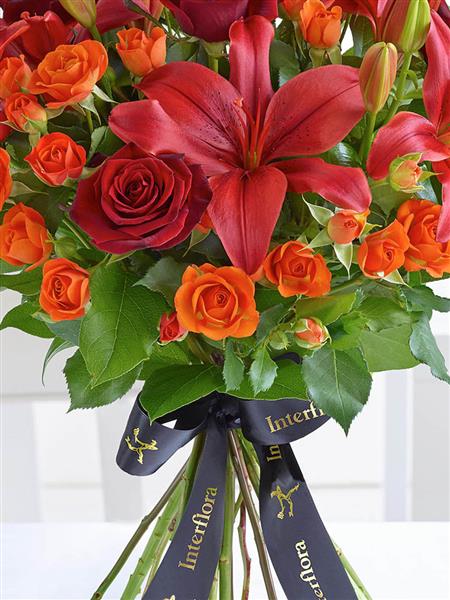 Featuring large headed Naomi red roses, orange spray roses, red Asiatic lilies and salal leaves, expertly handtied and presented in luxurious packaging for maximum impact when your gift is delivered.
