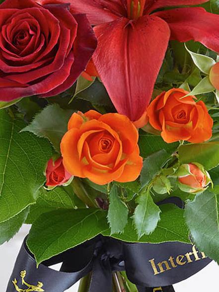The rustic orange, rich reds and lush greens in this sumptuous bouquet give it a real warmth and elegance. This classic combination of carefully selected roses and lilies is sure to delight someone special – this is a gift to really impress.