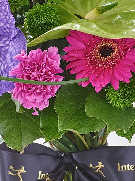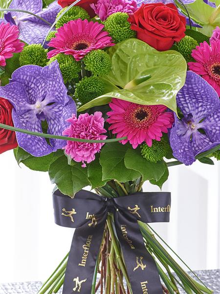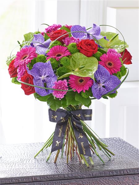 This exotic bouquet is perfect for a special occasion. Radiant orchid blooms in a wonderfully rich shade of deep purple are the height of luxury – and notice how their glorious colour is enhanced with contrasting lime, ruby and cerise flowers. A magnificent gift.