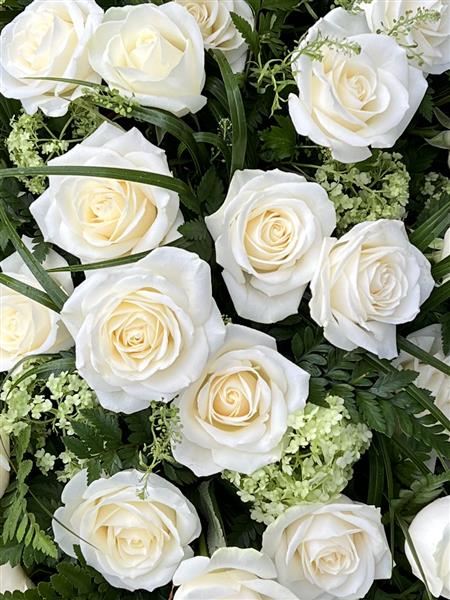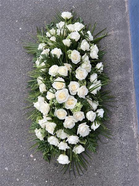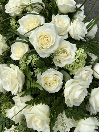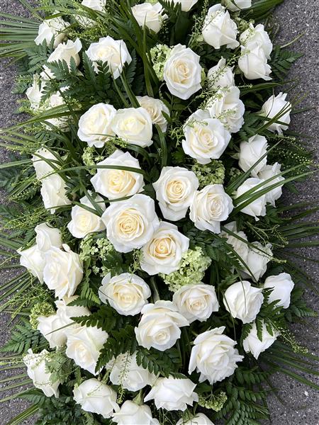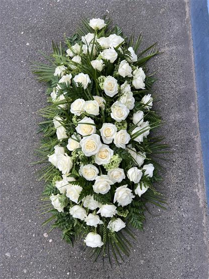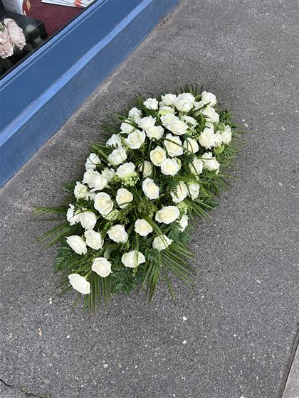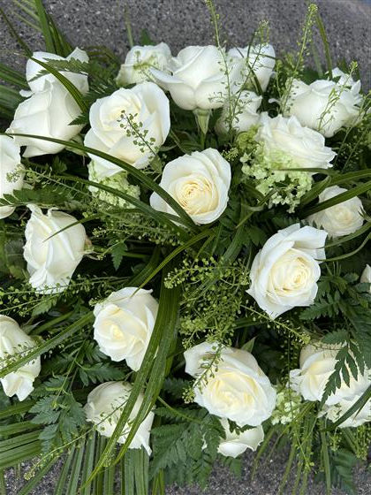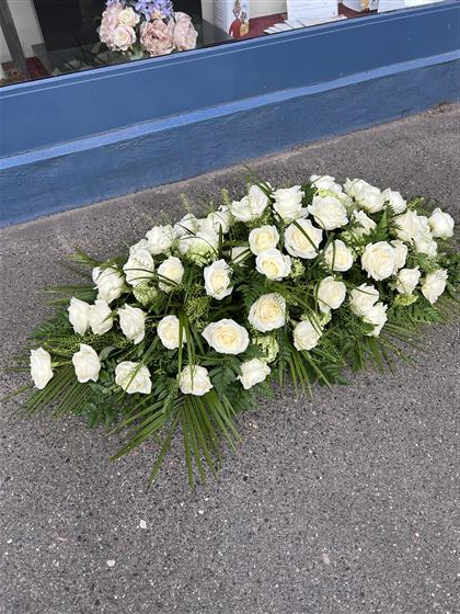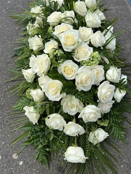 A beautiful White Rose coffin spray made with Thlaspi Green Bell foliage and Viburnum.