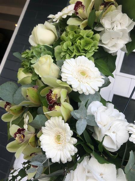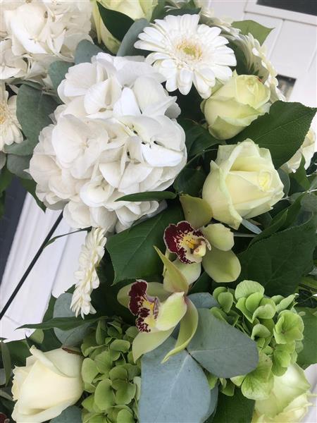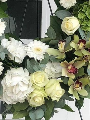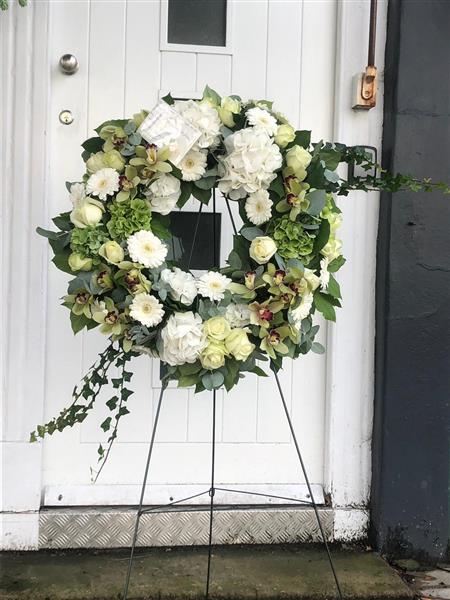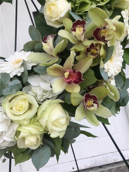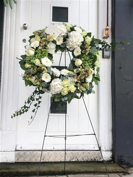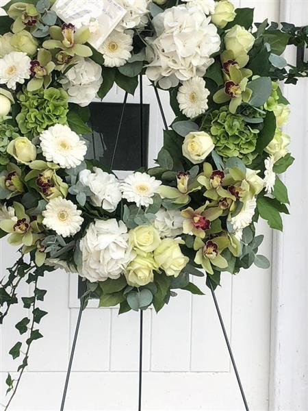 This XL Wreath on a stand is a beautiful tribute. made with the most beautiful flowers. Clusters of White Roses, Green Hydrnageas, White Hyddangeas, Green Cymbidium Orchids, White mini Gerberas, Eucalyptus, mixed foliage and Ivy Trails.