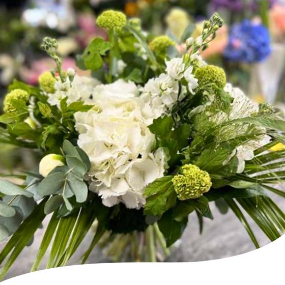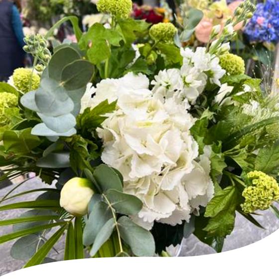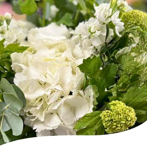 Created with care, our Luxury Whites Hand-Tied Bouquet showcases a luxurious mix of premium blooms. Delicate white Hydrangeas, white Peonies, Viburnum, Eucalyptus, and lush foliage are expertly arranged to create layers of timeless beauty. Each bouquet is aqua-packed for freshness.