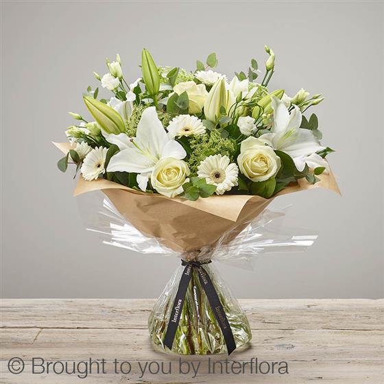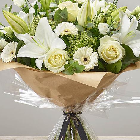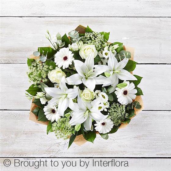 Featuring white germini, white Oriental lilies, white lisianthus, white large-headed roses and white ammi, hand-tied with eucalyptus and salal, presented in Gift Packaging.