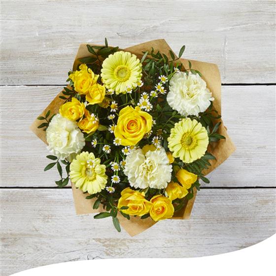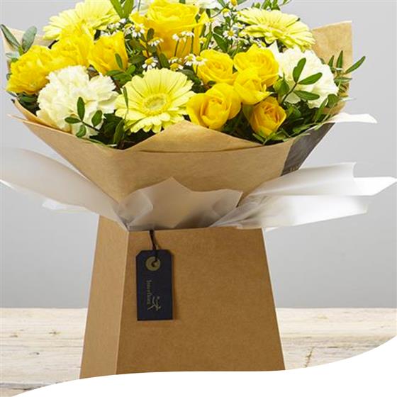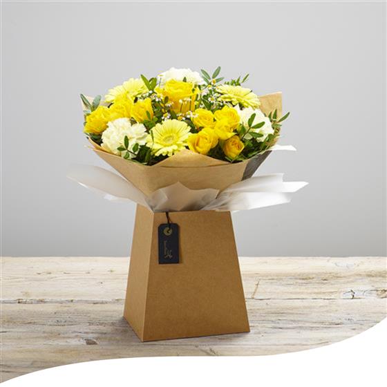 Introducing our Mellow Bouquet, a charming hand-tied of beautiful flowers arranged in water and nestled into a decorative gift box. This delightful flower arrangement features Yellow Roses, Spray Roses, Cream Carnations, and Yellow Gerberas, accented with delicate Gypsophila and foliage for added elegance.