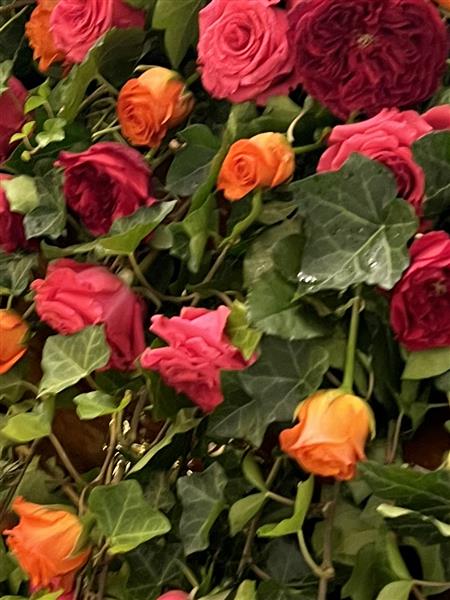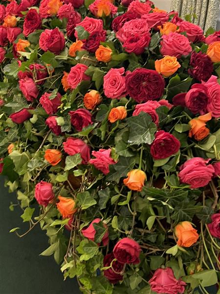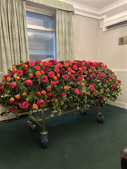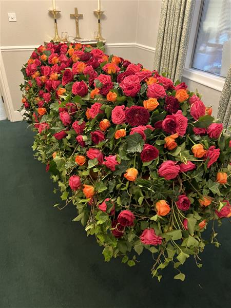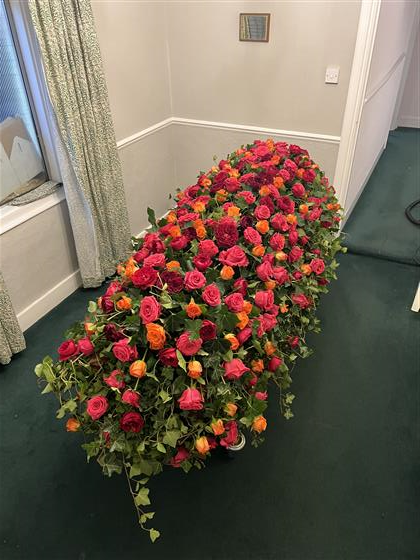 Ivy trailing down the whole coffin, basically concealing the whole thing. Roses are sealed and then individually wired in all the way around.