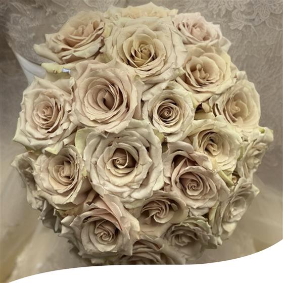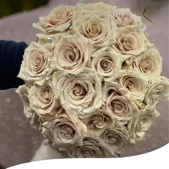 Explore the exquisite charm of our Menta Garden Rose Bridal Bouquet. The Menta Rose is meticulously grown for its superior quality and sophistication, making it the perfect choice for a classic bridal floral arrangement. Offered in two sizes, this bouquet includes 14 (standard) or 22 (large) fully bloomed Menta Roses.