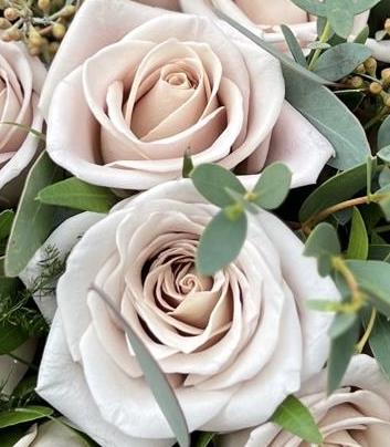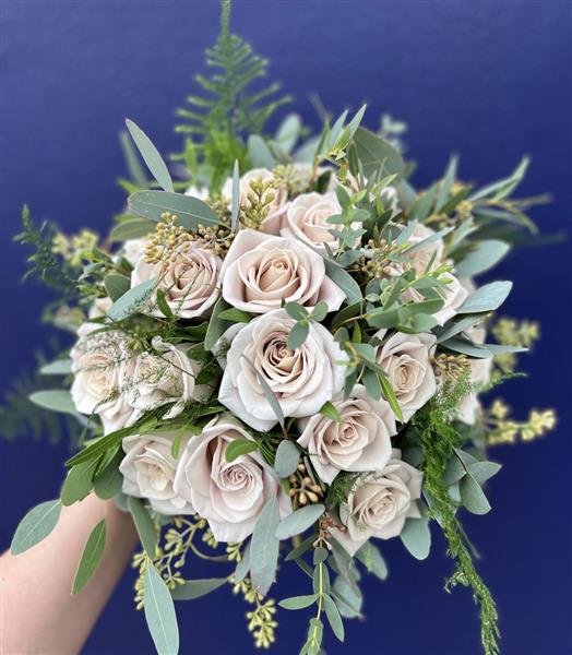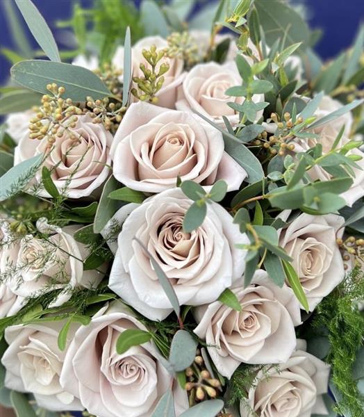 We make this stunning fragrant bridal bouquet using 25 Menta Garden roses. They have the most amazing smell and are the most beautiful pastel colour. Delicate petals and hints of pale pink on the tips of the petals. These are gorgeous and are perfectly open for the big day. We added Mixed berries eucalyptus, Parvi and Populus Eucalyptus. Geeen Asparagus ferns give a delicate look.