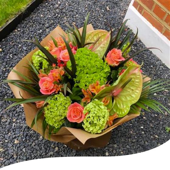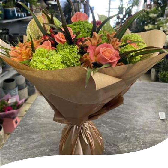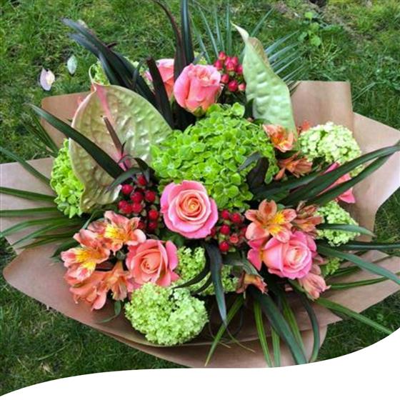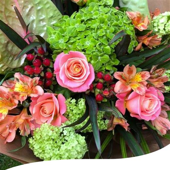 Introducing our Miss Piggy Bouquet, a stunning hand-tied arrangement that features Miss Piggy Roses, Green Hydrangeas, Viburnum, Green Anthuriums, Orange Alstroemeria, Red Hypericum Berries, and a mix of lush foliage including Dracaena tails. This exquisite bouquet is aqua-packed and elegantly wrapped, ready to make a lasting impression.