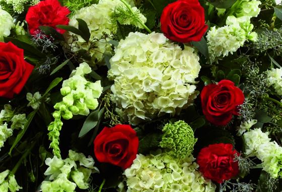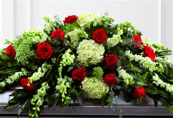 Rich red Rose and carnations are an eye-catching addition to a bed of white hydrangea, larkspur, antirrhinum, Queen Anne's lace and choice foliage to create a beautiful casket spray.