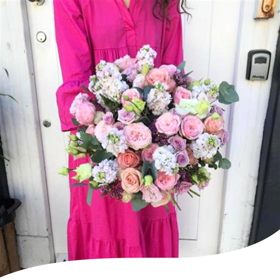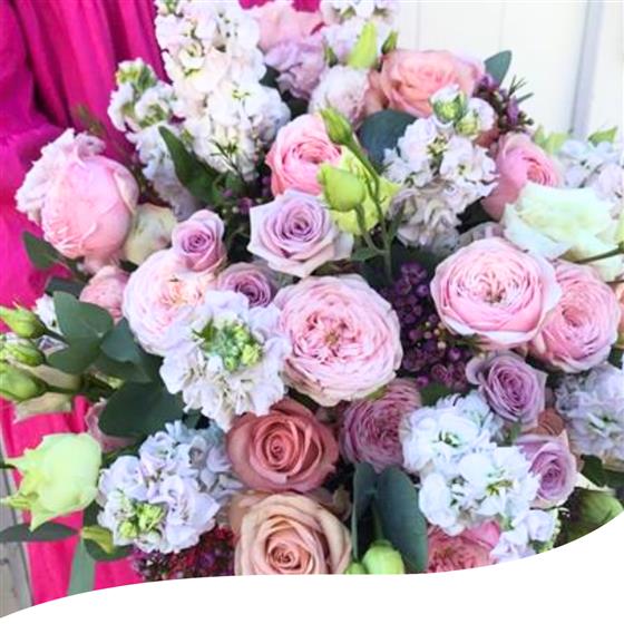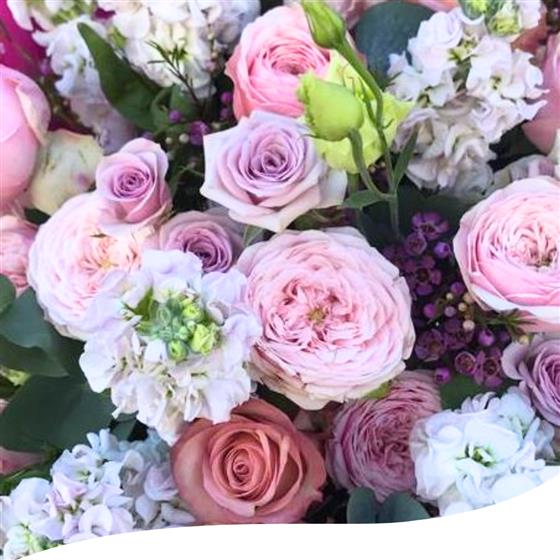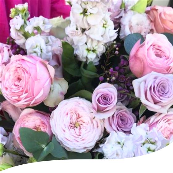 Introducing our Mixed Garden Rose Bouquet, a beautiful arrangement featuring a variety of garden blooms. This exquisite bouquet includes mixed varieties of Garden Roses, Stocks, Bouvardia, Lisianthus, Spray Roses, Wax Flowers, and lush Eucalyptus.