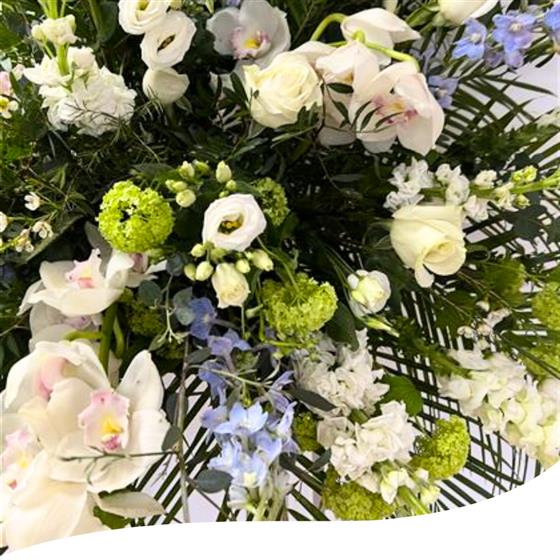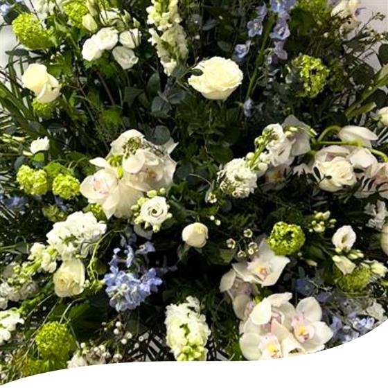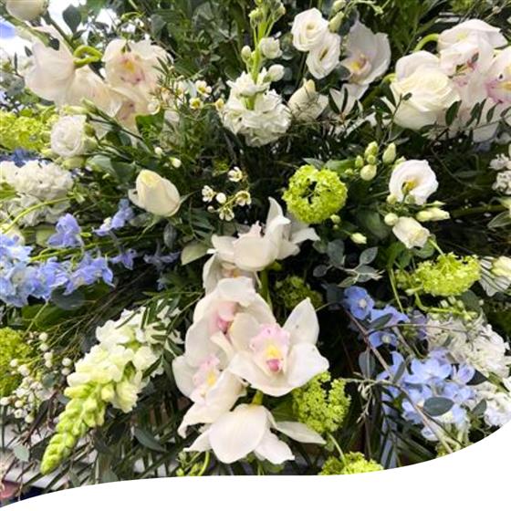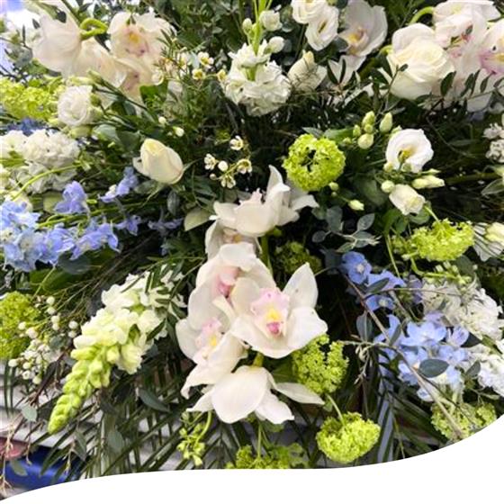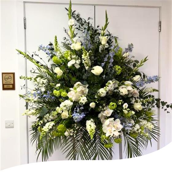 A beautiful pedestal arrangement using Orchids, Roses, Lisianthus, Antirinums, Viburnum, Pale Blue Delphiniums, Wax Flower, Stocks and Thlaspi Green Bell.