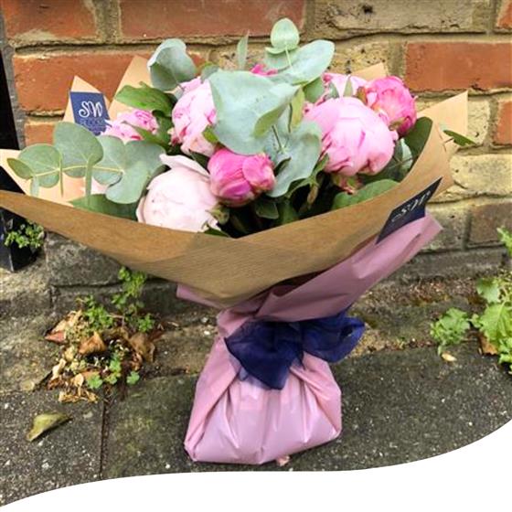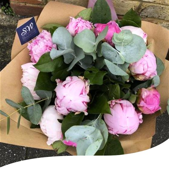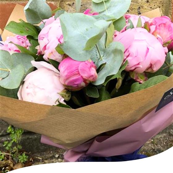 Celebrate the summer Peony season with our enchanting Mixed Peony Bouquet. This beautiful arrangement features a selection of Peonies, complemented by Panicum fountain grass and Eucalyptus. Each bouquet is hand-tied and gift-wrapped in water to ensure lasting freshness.