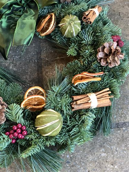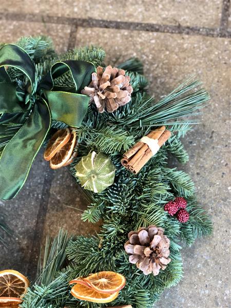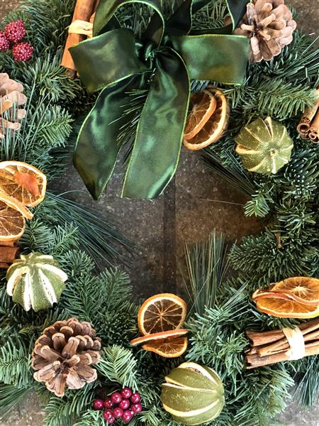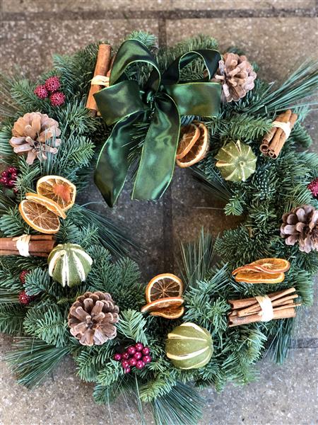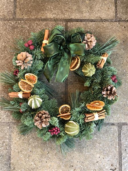 This lovely mixed pine wreath has Pine Cones, Small Raspberries, Cinnamon Sticks, Dried Limes and Orange Slices. Finished with a lovely Bow.