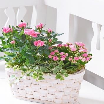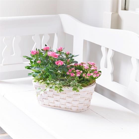 Featuring a pale pink kalanchoe, a white kalanchoe, a pink rose plant, ivy and palm, all planted in a grey washed woven basket.