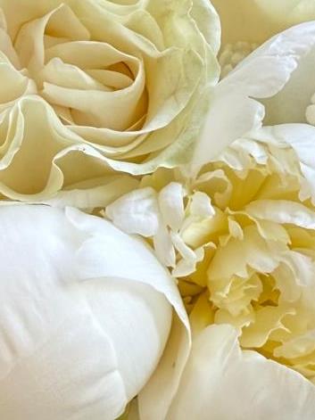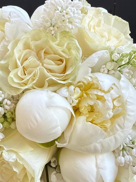 A beautiful mixed wedding bouquet of white flowers. Using Cream Mondial Roses, White Syringia, White Peony’s, a small touch of foliage around the edge.