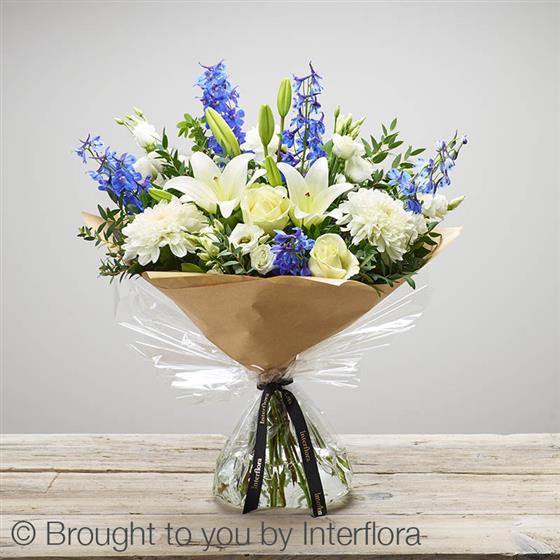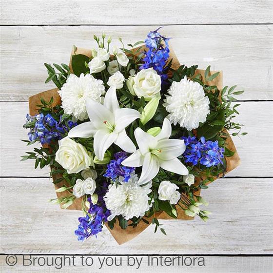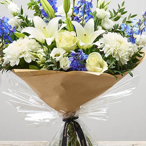 Featuring white LA lilies, white large headed roses, white chrysanthemum blooms, white lisianthus and blue delphinium, hand-tied with salal, pistache and eucalyptus, presented in Gift Packaging.