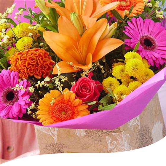 Featuring a delightful assortment of Lilies, Gerberas, Spray Roses and more, this hand-tied promises an explosion of rich, radiant colours including cerise, purple, fiery orange and saffron yellow. It's the perfect way to infuse her special day with a burst of joy.