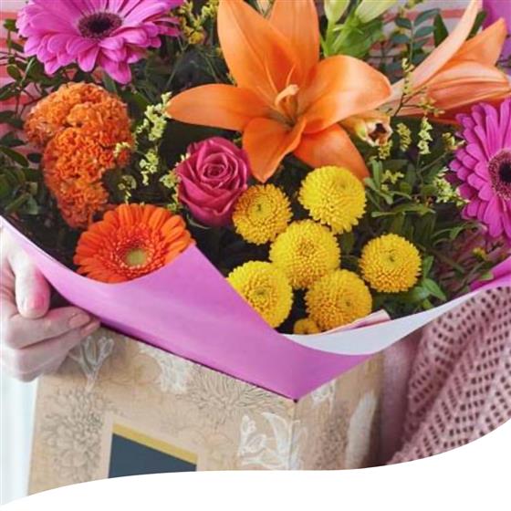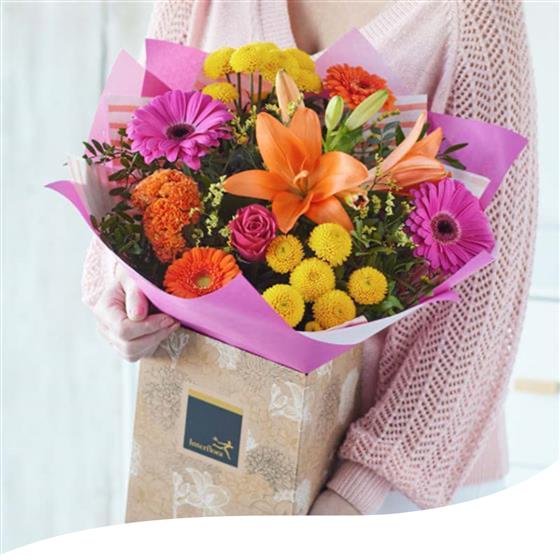 Featuring a delightful assortment of Lilies, Gerberas, Spray Roses and more, this hand-tied promises an explosion of rich, radiant colours including cerise, purple, fiery orange and saffron yellow. It's the perfect way to infuse her special day with a burst of joy.