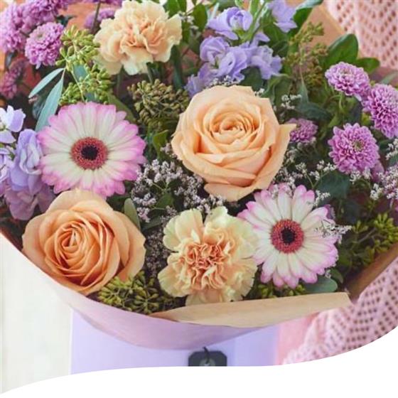 Indulge in a palette of soft, dreamy colours, from delicate pinks and lilacs to soothing peaches and creams, accented with hints of cerise and green. A perfect expression of love and appreciation for the special women in your life.