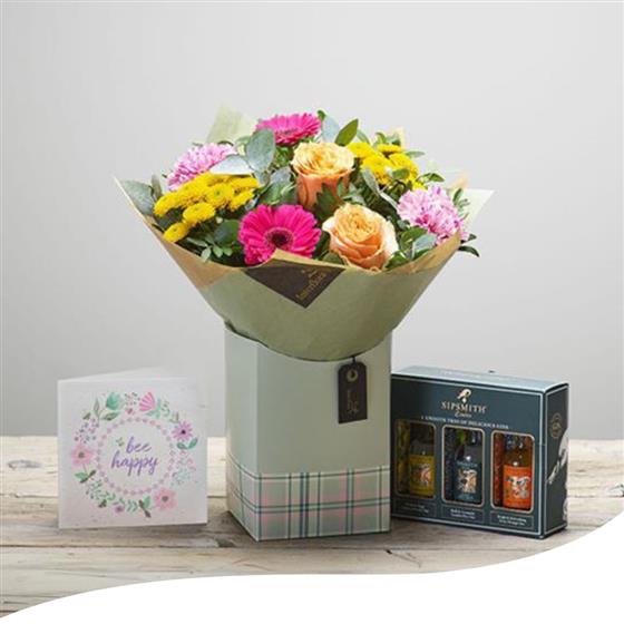 Introducing our Mother's Day Gift Set - Evergreen, Gin Tasting Trio & Card. This beautiful set features our Evergreen hand-tied arrangement accompanied by our Sipsmith Gin Tasting Trio and a heartfelt greeting card.