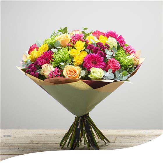 Enhance your Mother's Day present with our exquisite Mother's Day Hand-Tied - Deluxe Garden Fantasy (Extra Large). This charming assembly boasts a lively blend of vibrant stems, meticulously hand-tied by our florists using the freshest available on the day.
