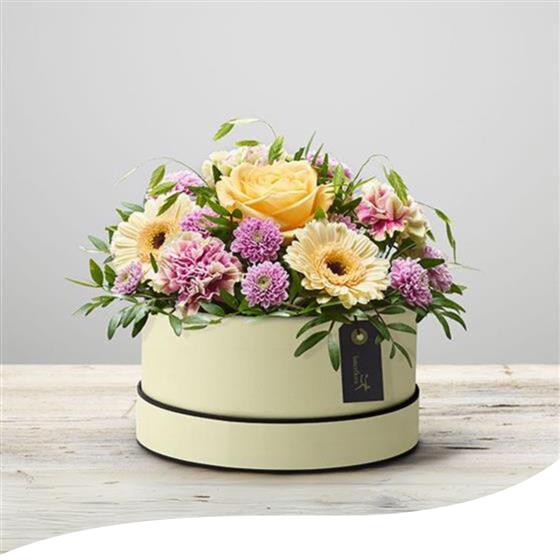 Celebrate Mother's Day with a gift as special as she is. Our pastel-themed hatbox arrangement exudes elegance and charm, perfect for conveying your love and appreciation.
