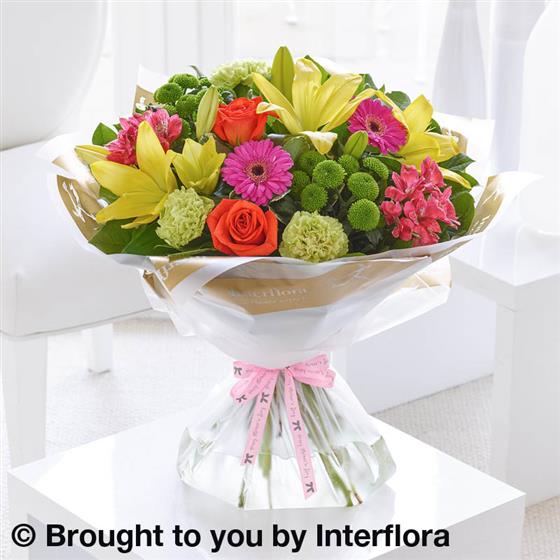 Someone is going to love this gift. The kaleidoscope of radiant colour ensures this striking hand-tied takes centre stage right away. With roses, lilies, carnations, chrysanthemums and so much more, this is certainly the right choice of gift to make an impression.