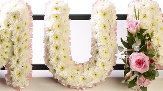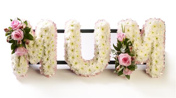 The pristine white letters in the personal tribute to Mum are formed with an array of delicate fresh double chrysanthemums. Each letter is edged with pink ribbon and the display is decorated with stunning pink roses and alstromeria with lush greenery.