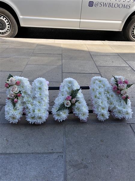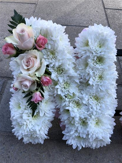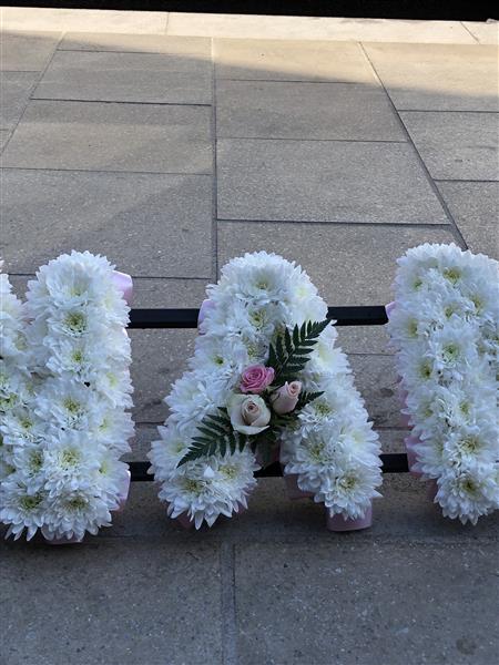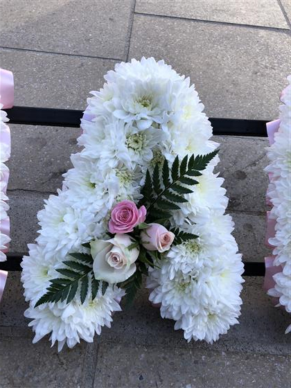 This Nan tribute comes in pale pinks and whites. With Roses, Freesia, Veronica and Chrysanthemums. Pink ribbon edge.