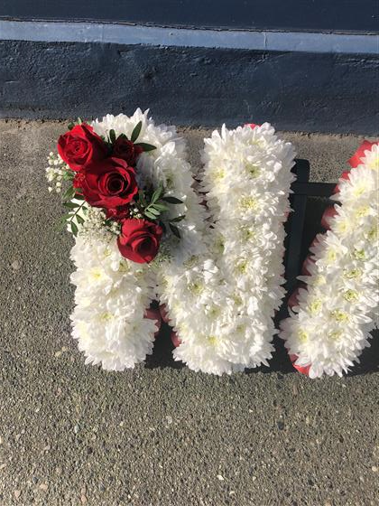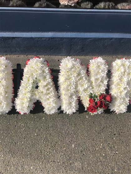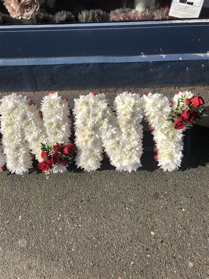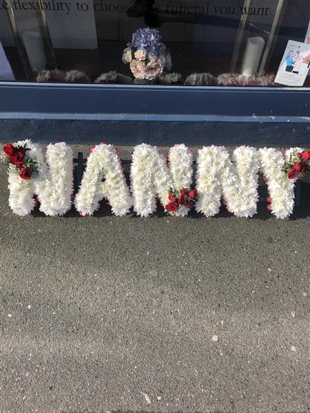 A Nanny Tribute made with Ribbon Edge, White Chrysanthemum base and Rose sprays to match.