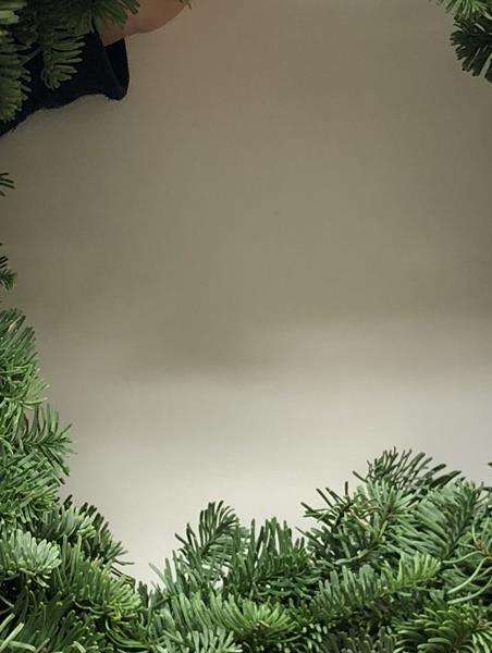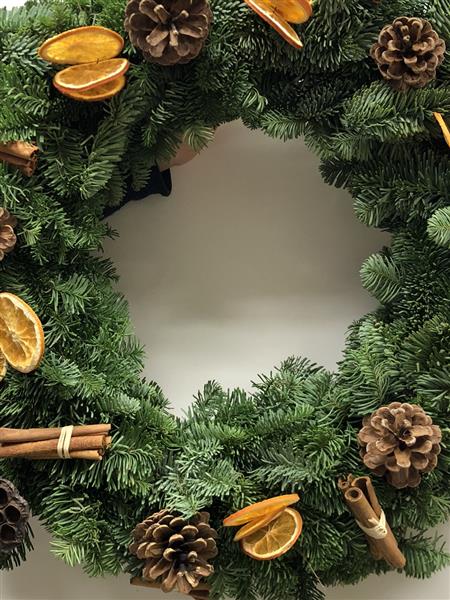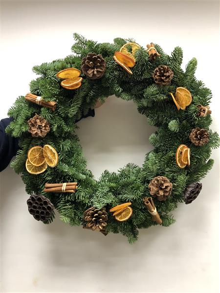 A natural door wreath which shows off the beautiful Blue Pine but decorated with Oranges, Orange Slices, Cinnamon Twigs and Pine Cones.