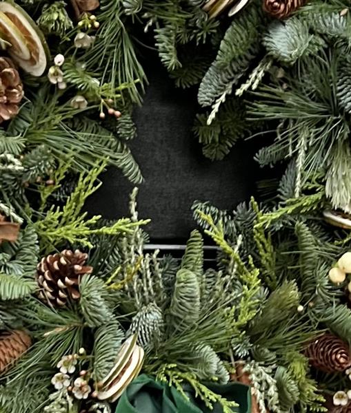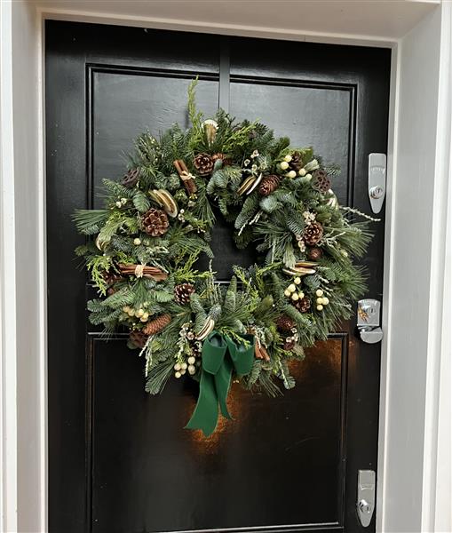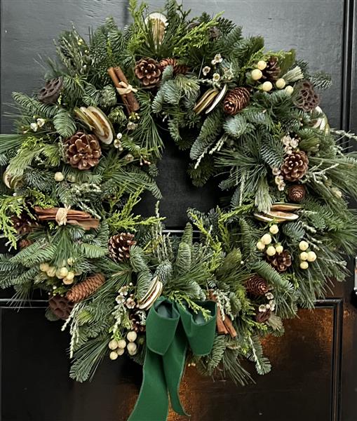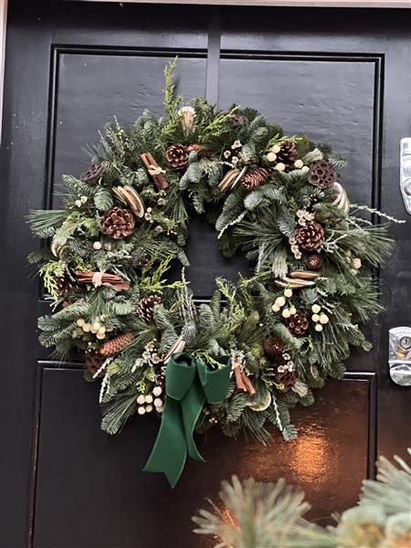 Our natural green and brown door wreath is made with Dried Pine cones, Cinnamon and Berries.