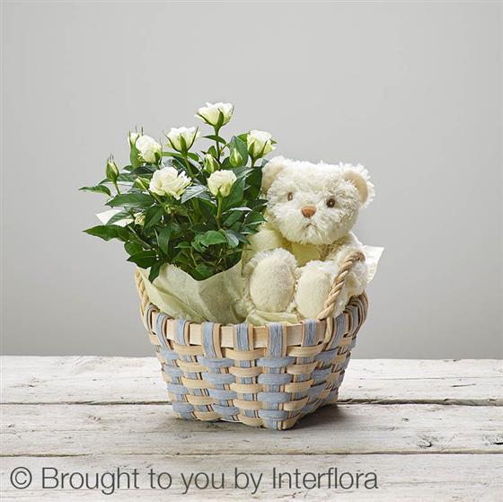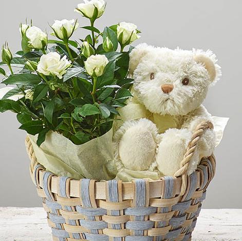 Featuring a white rose plant, presented in a two tone woven basket with ears, paired with a cute cuddly toy.