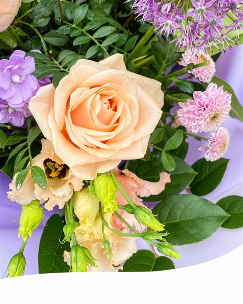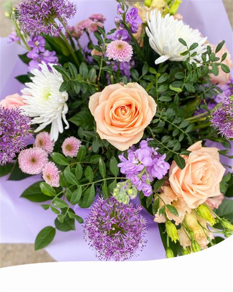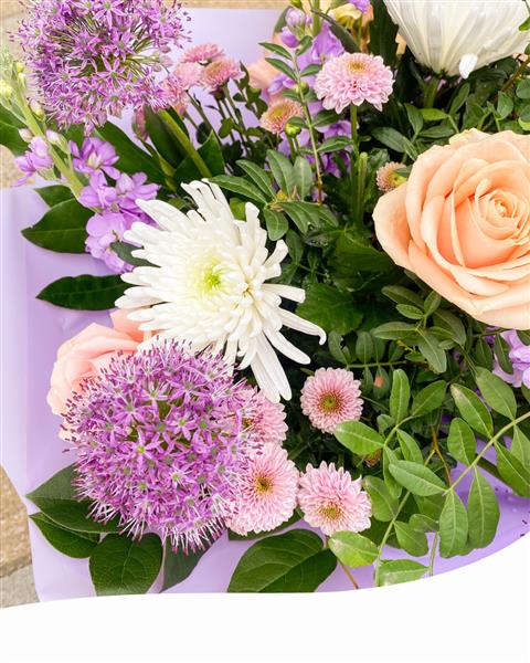 Introducing our Nice Vibes Hand-Tied Bouquet, a stunning ensemble of summer blooms in soft pastel tones, carefully curated to evoke the serene essence of the season. Each blossom is hand-selected and artfully arranged, creating a harmonious display of natural beauty.
