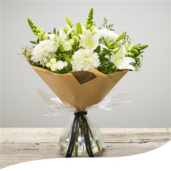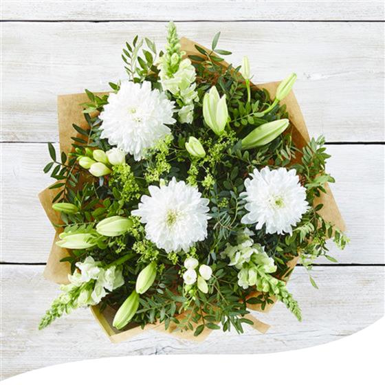 Immerse yourself in the elegance of our Opal Shimmer Bouquet. Featuring a harmonious blend of white and green blooms, this arrangement enchants with its shimmering allure and graceful charm. Perfect for adding sophistication to any occasion, each bloom is hand-tied and presented with care, ensuring a stunning display that sparkles with opulence.