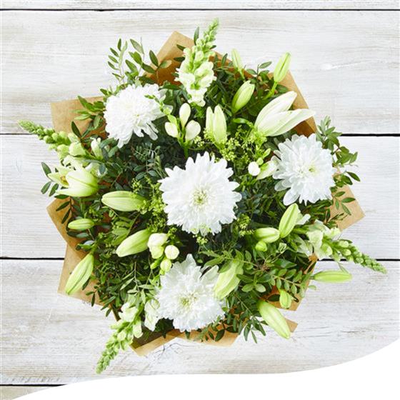 Experience the timeless elegance of our Opal Shimmer Bouquet (Large), a stunning all-white arrangement designed to captivate and inspire. This exquisite bouquet features a harmonious blend of pristine blooms, including elegant Lilies, delicate Antirrhinums, and other refined white flowers.