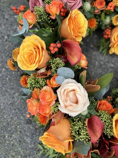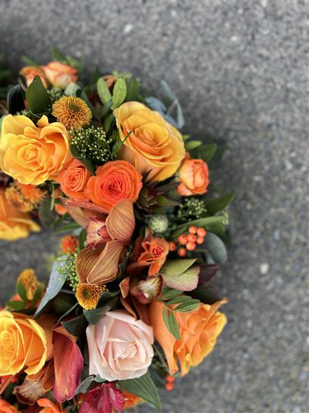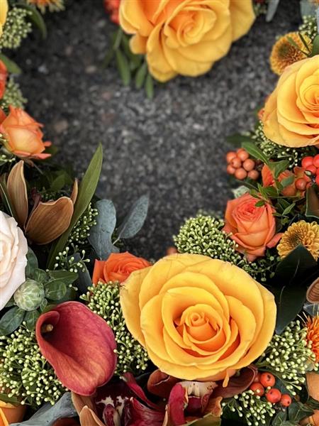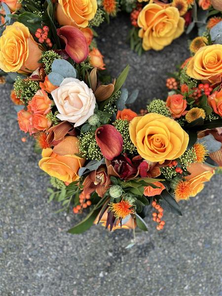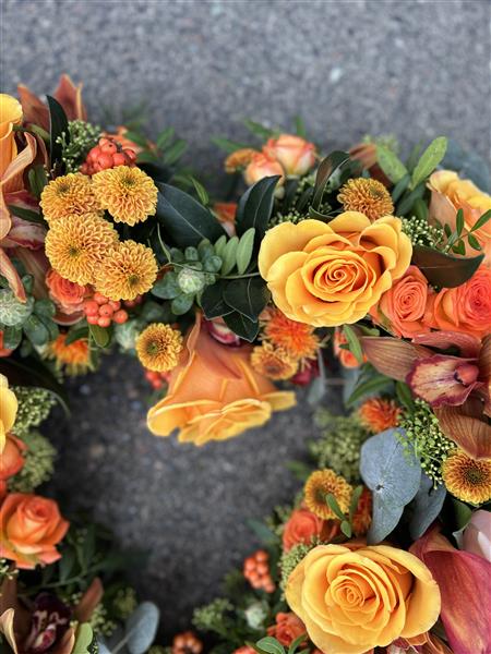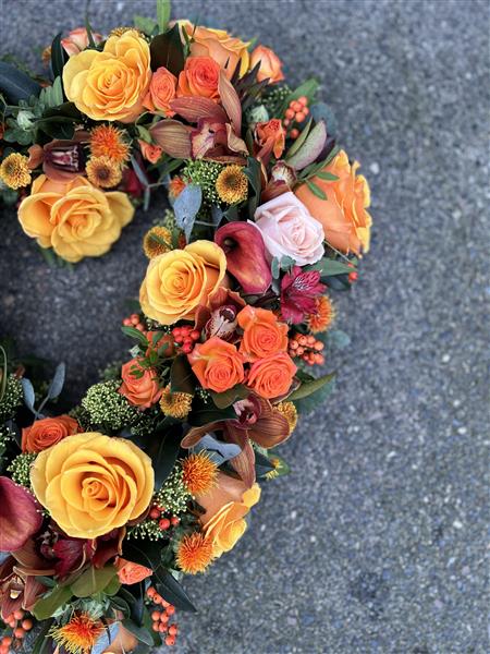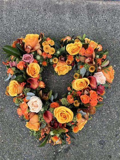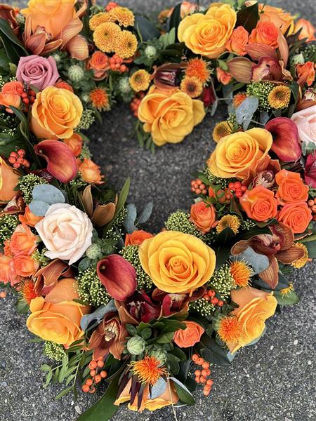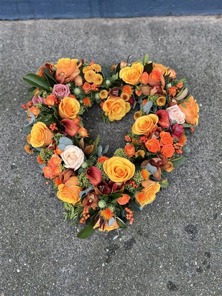 A truly beautiful large open heart tribute. Using tycoon Ecuadorian roses, Green Skimmia, Orange mango calla Lily, Carthamus, Orange Spray Roses, Orange Cymbidium Orchids, Red Hypericum Berries, Orange Chrysanthemum Santini and mixed foliage including eucalyptus.