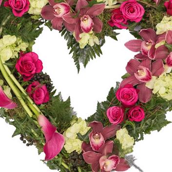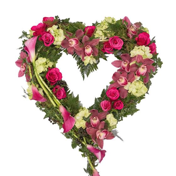 An open Heart tribute made with all different shades of Pink and purple flowers. Pink Cerise roses, Purple Cymbidium Orchids, Pink Calla Lily, Green Hydrangea and mixed Foliage.