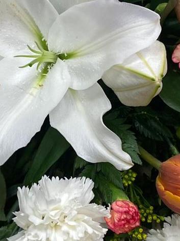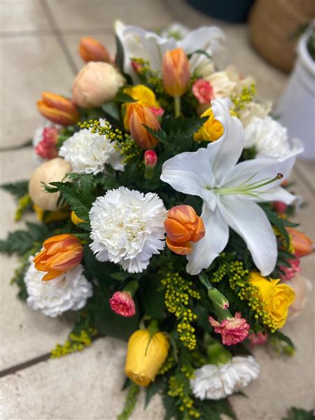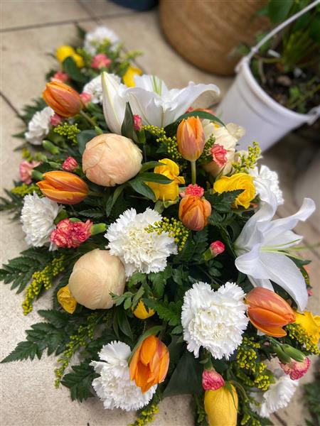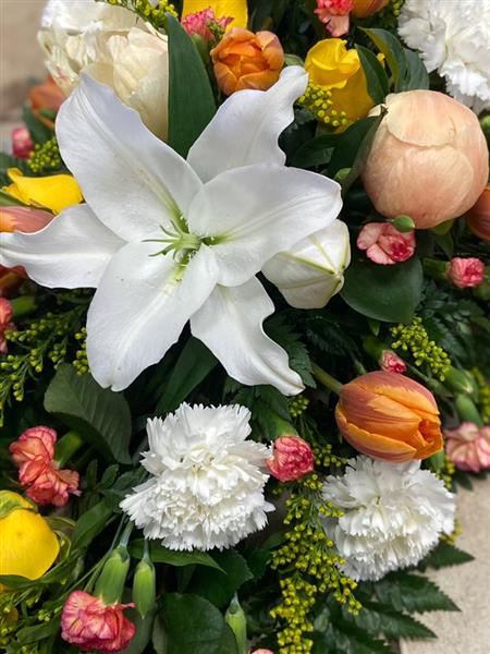 A single ended Tear drop spray in Peach, Orange, White and Yellow. We will use a mix of flowers including Lily and Roses, Soli, Spray Carnations, Tulips and Lisianthus.