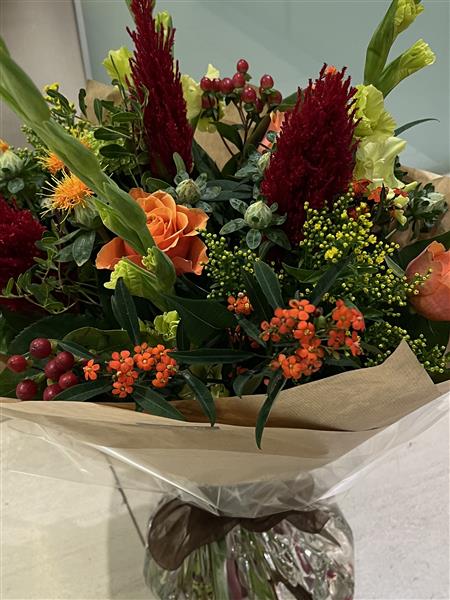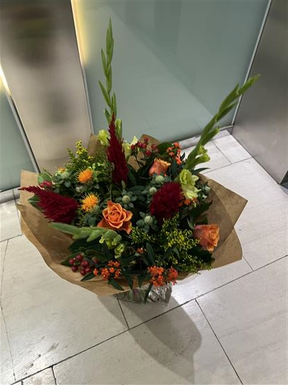 A nice autumnal mix using Carthamus, Orange Roses, Euphorbia, Soli, Gladioli, and oak leaves.