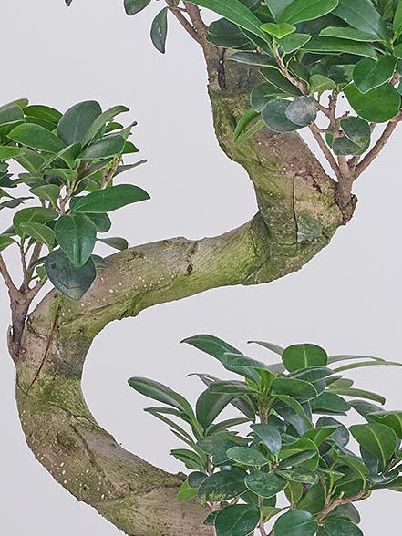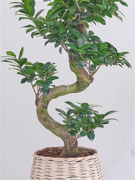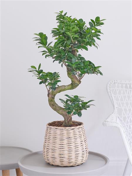 Featuring a ficus ginseng planted with moss and compost in a round tapered bulbous basket.