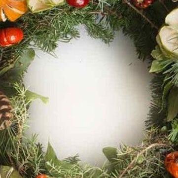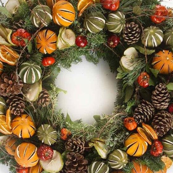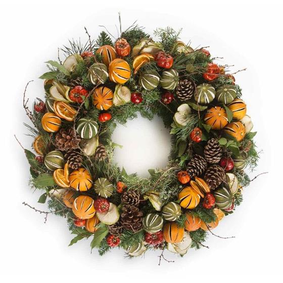 A mixed pine door wreath consisting of Limes, Oranges, Dried fruit, Pine cones and twigs.